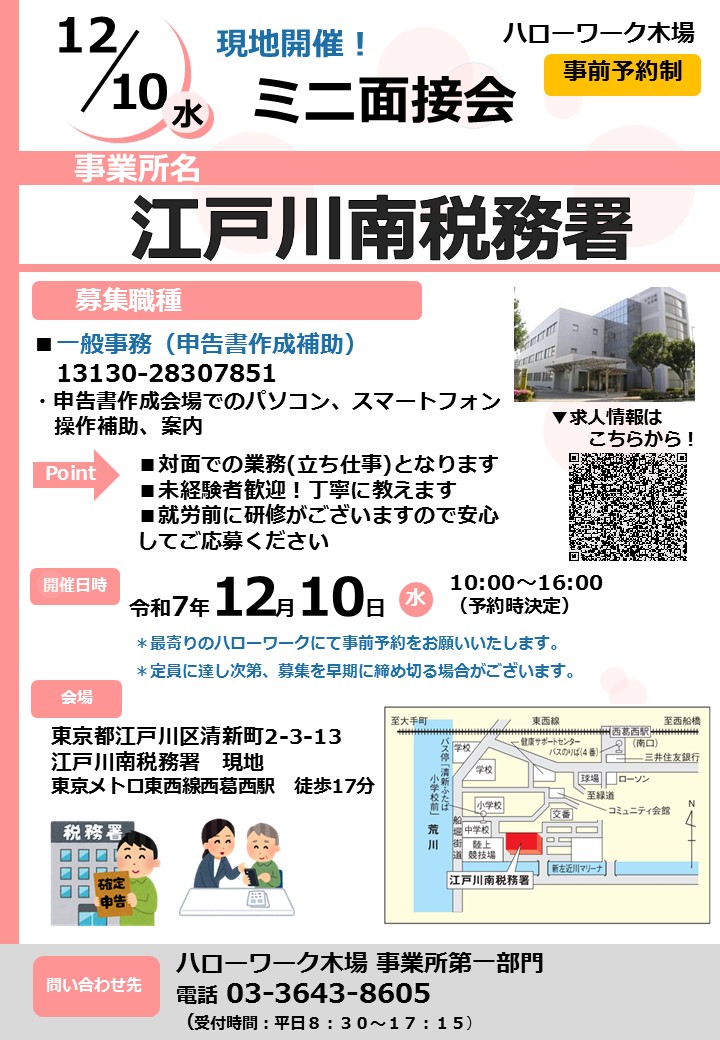 - 予約制:面接を希望する方は、最寄りのハローワークを通じて事前予約をお願いします。