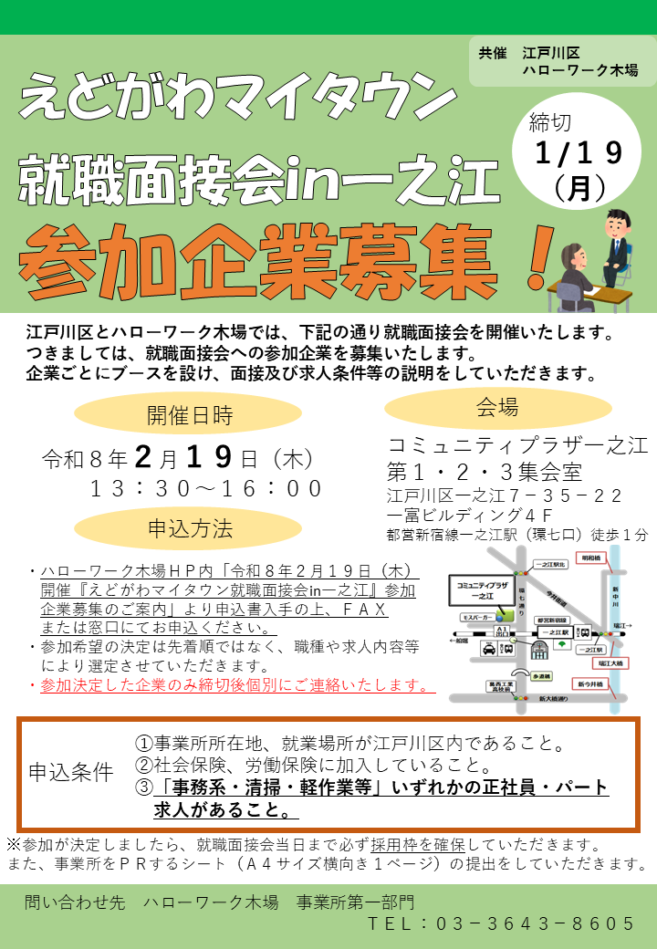 「えどがわマイタウン就職面接会 in 一之江」参加企業募集のご案内