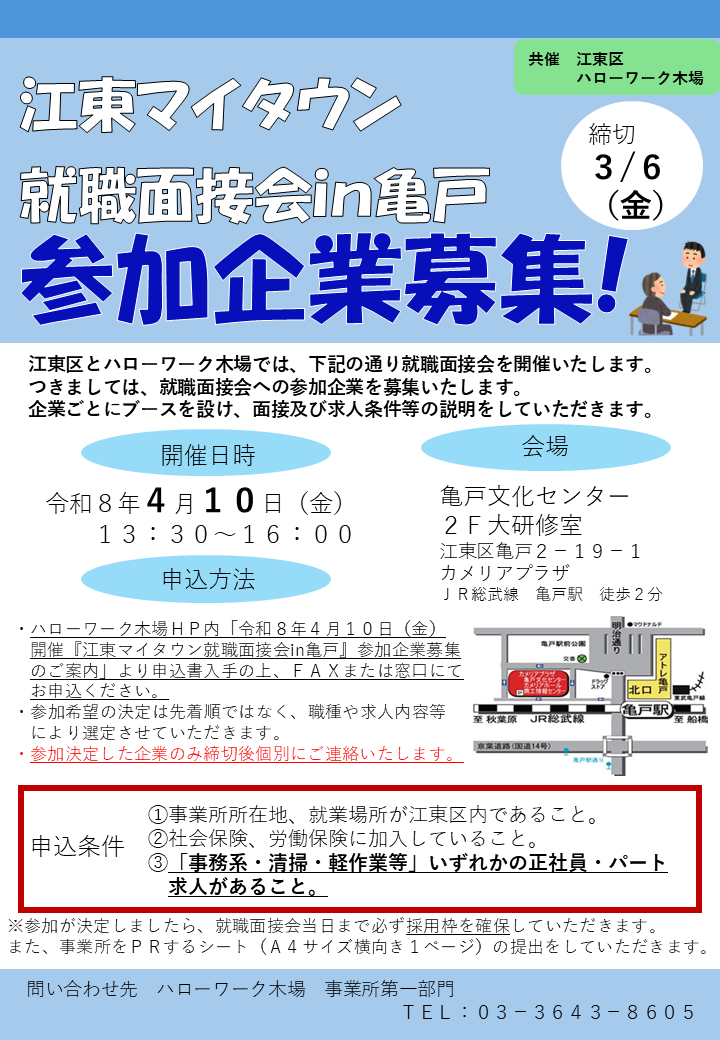 「江東マイタウン就職面接会 in 亀戸」参加企業募集のご案内