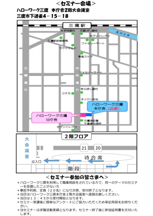 - ハローワーク三鷹 本庁舎2階大会議室(三鷹市下連雀4‐15‐18)