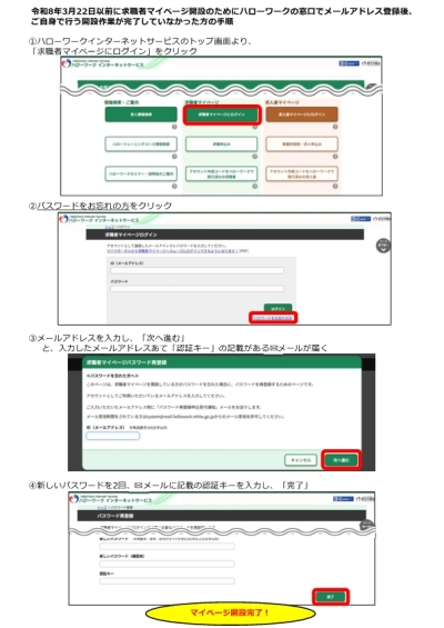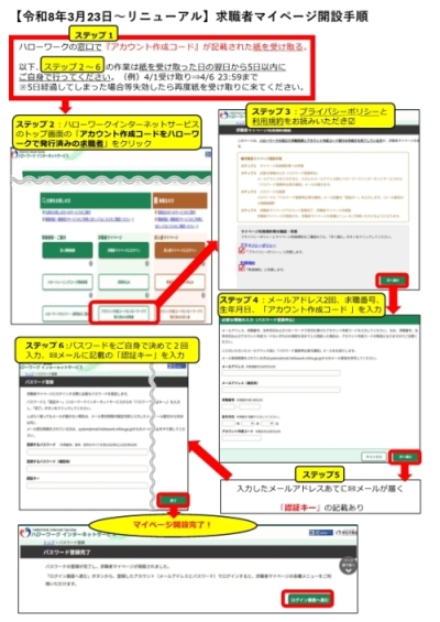 ●ハローワークの窓口で『アカウント作成コード』が記載された紙を受け取った方▶▶▶コチラ ●3月22日以前にハローワークの窓口でメールアドレス登録後、ご自身で行うマイページ開設が完了していなかった方▶▶▶コチラ