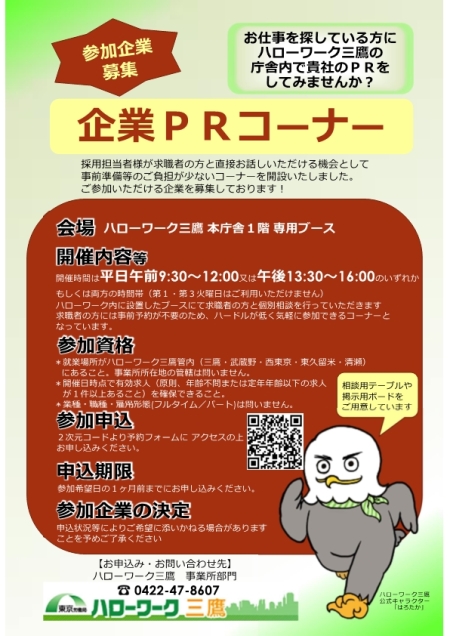 ハローワーク三鷹に来所された求職者に直接お声かけをしていただき、会社内容・仕事内容のご説明をしていただくことができます。
