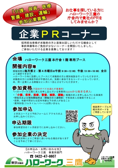 お仕事を探している方に、ハローワーク三鷹の庁舎内で貴社のPRをしてみませんか?