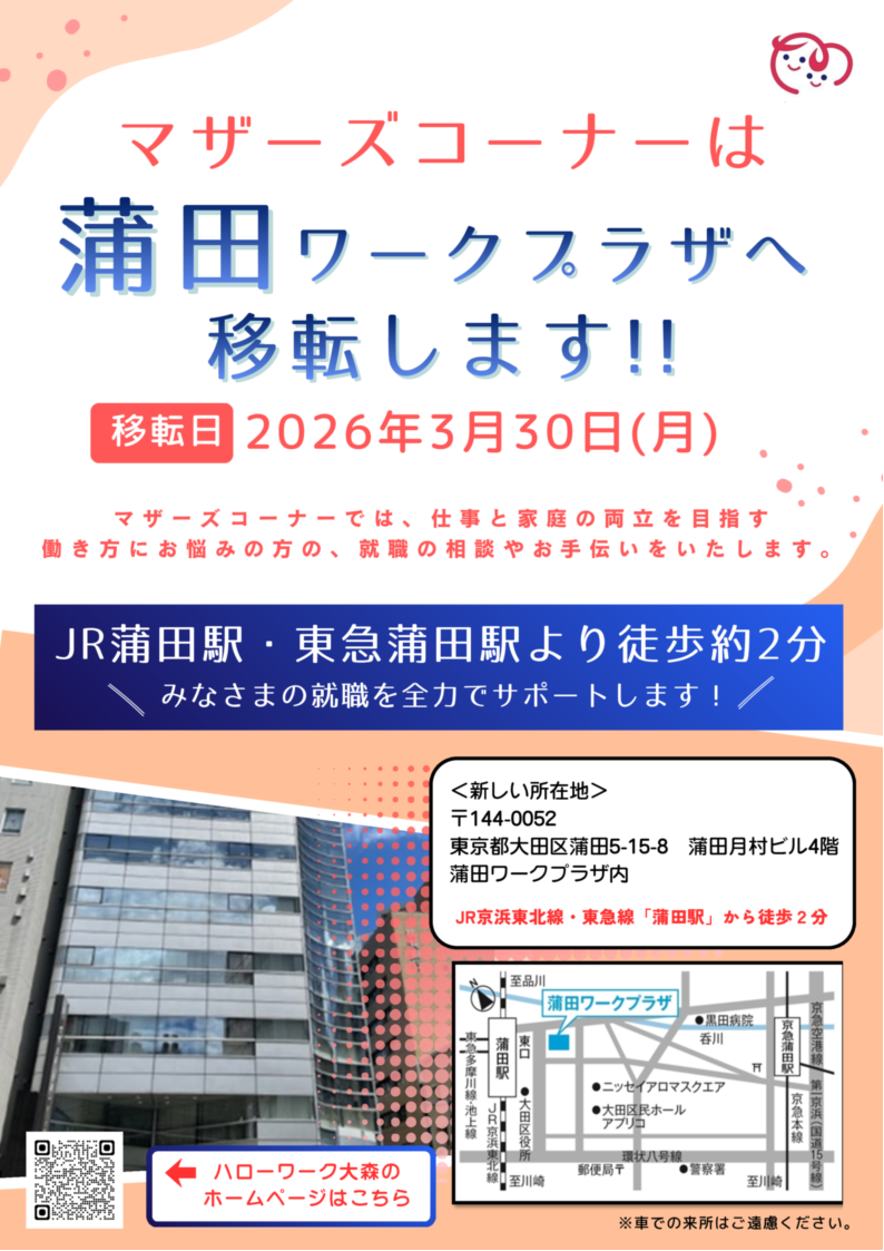 仕事と家庭の両立を目指す方をサポートするマザーズコーナーは、2026年3月30日から蒲田駅前の「蒲田ワークプラザ」に移転します!