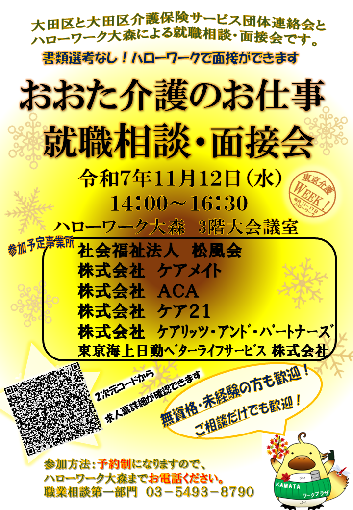 大田区・大田区介護保険サービス団体連絡会・ハローワーク大森が一体となって行う就職相談・面接会です。事前にお申し込みいただければ当日はすぐ面接ができるほか、介護業界への就職を考えている方はご相談のみでもOK!資格の無い方・未経験の方も大歓迎です。