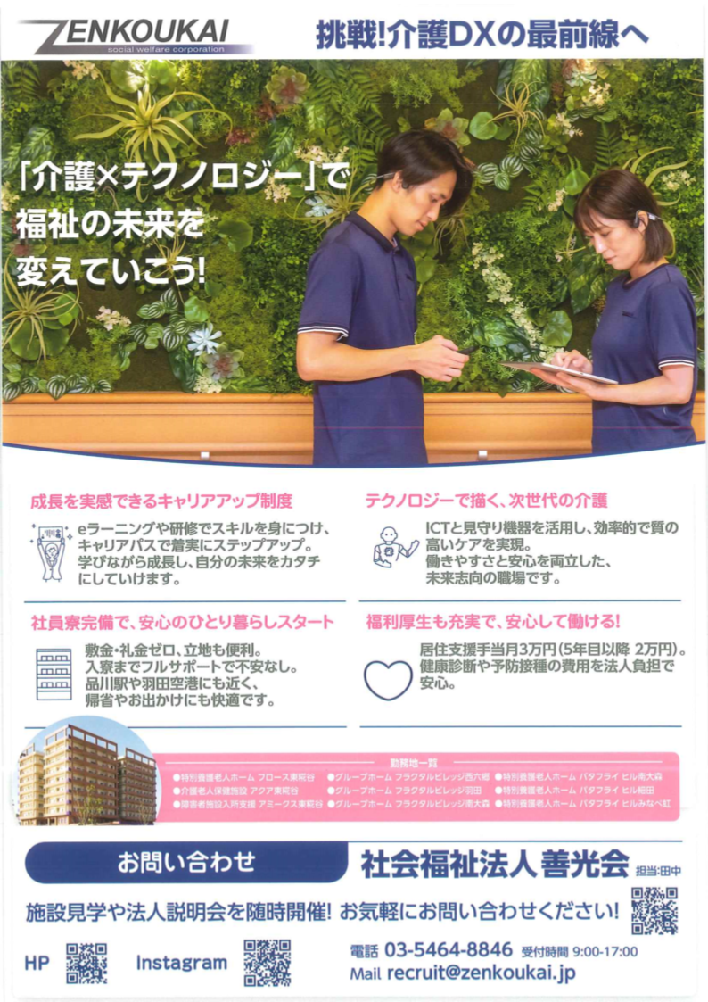 社会福祉法人善光会は❝社会で得た利益は社会に還元する❞という考えのもと設立された社会福祉法人です。東京都大田区・葛飾区で福祉施設を幅広く運営しています。より良い福祉業界を作るために、介護ロボットやAI等の先進的なテクノロジーの活用にも取り組んでおります。