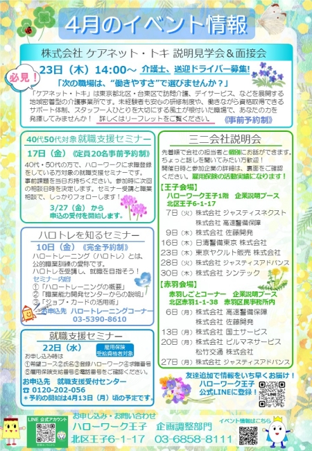 ※4/22(水)開催の「就職支援セミナー(雇用保険受給資格者対象)」につきましては、4/13(月)頃から予約開始の予定です。