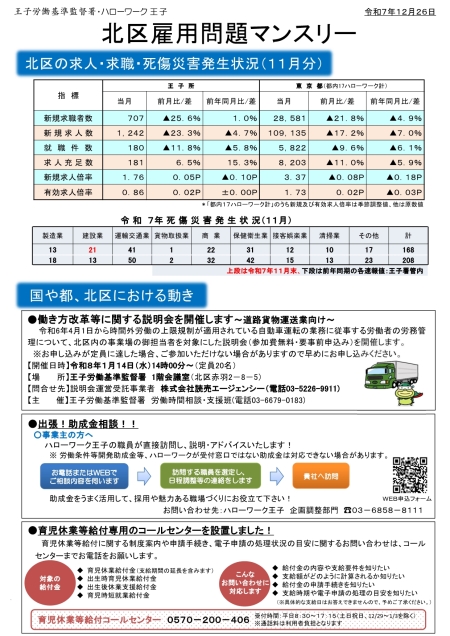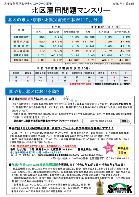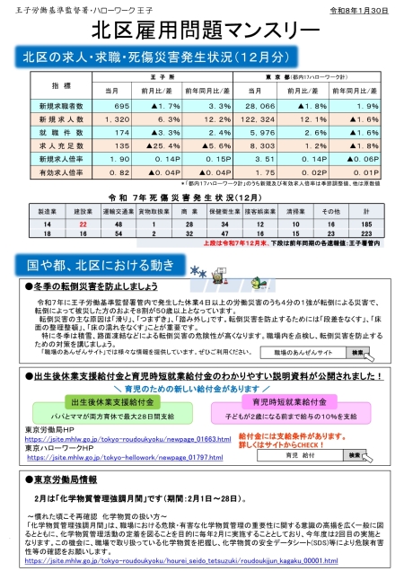 王子労働基準監督署の協力を得て、北区内の求人・求職・死傷災害発生状況、国や都、北区における動きについて記載しています。