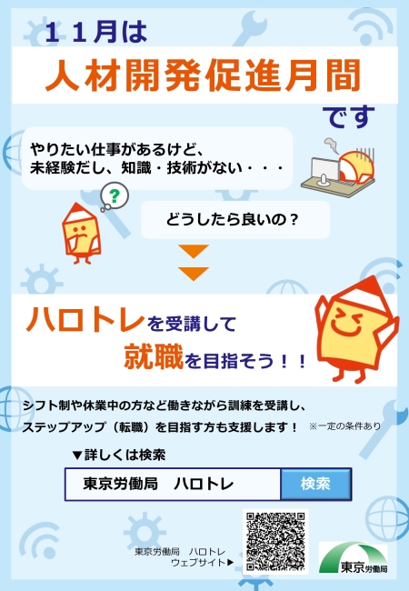 厚生労働省では、職業能力の開発・向上の促進と技能の振興を目指し、11月を「人材開発促進月間」、11月10日を「技能の日」としています。