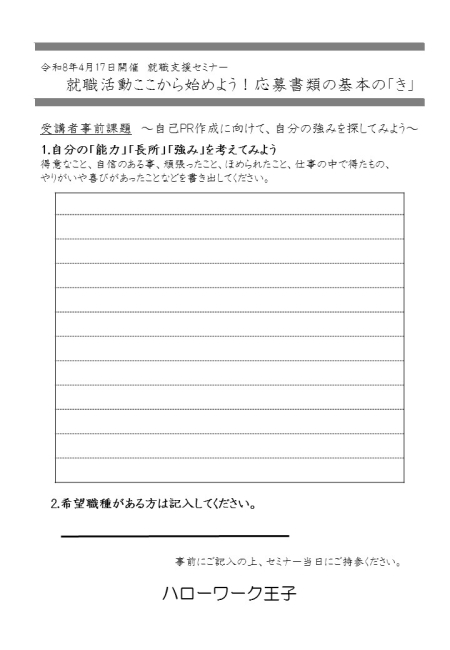 - 40代・50代でハローワークに求職登録されている方(同内容のため、過去にハローワーク王子主催の40代・50代対象 就職支援セミナーを受講された方は参加できません。)
