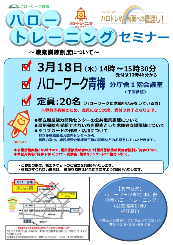▼詳しくはリーフレット(PDF)をご覧ください。 <お問い合わせ> ハローワーク青梅 職業相談第二部門 本庁舎1階 ②番 ハロートレーニング(公的職業訓練)相談窓口 TEL:0428-28-8808