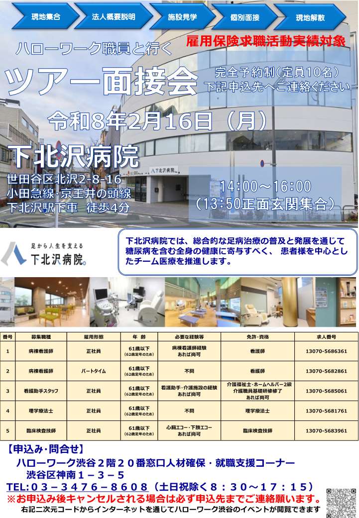 【ハローワーク渋谷】2/16(月) ハローワーク職員と行くツアー面接会のお知らせ 下北沢病院
