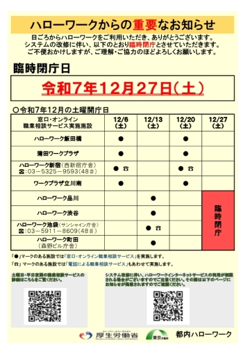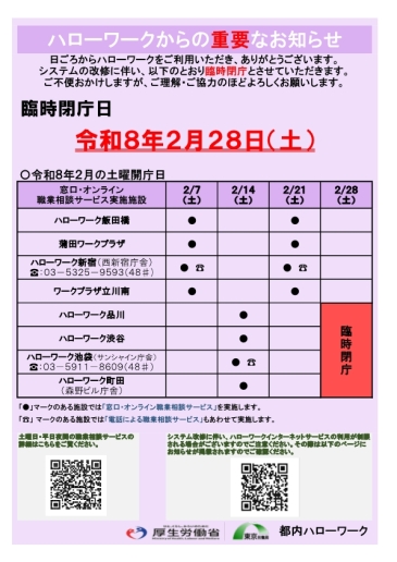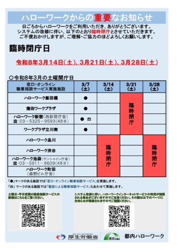 ⇒都内ハローワークの夜間開庁、土曜開庁について、詳しくは東京ハローワークページにてご案内しています。