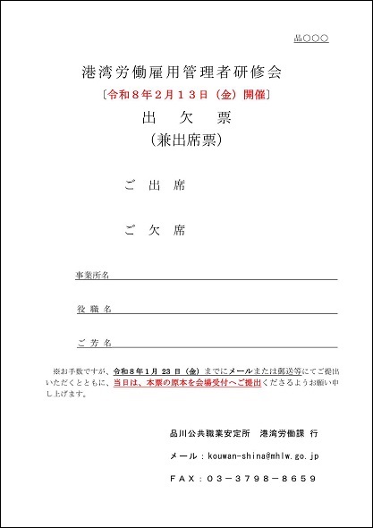 港湾労働雇用管理者のほか、労務管理等のご担当者のご出席をお待ちしております。