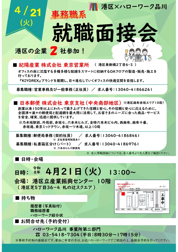 【令和8年4月21日(火)】港区・ハローワーク品川 就職面接会(事務職系・2社)のお知らせ