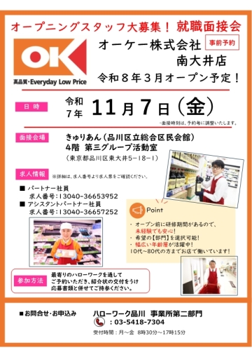 【令和7年11月7日(金)】オーケー株式会社 南大井店(仮称)ミニ就職面接会のお知らせ