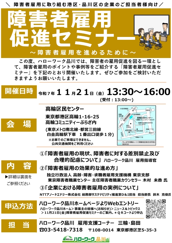 ハローワーク品川では、障害者の雇用促進を図る一環として、障害者雇用に取り組む港区・品川区の企業のご担当者向けに、障害者雇用のポイントや事例等をご紹介する「障害者雇用促進セミナー」を以下のとおり開催いたします。