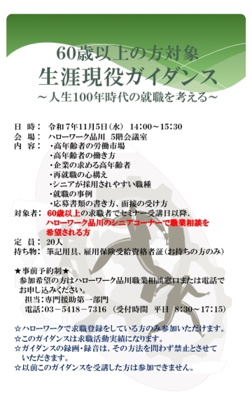 60歳以上の方でセミナー受講日以降、ハローワーク品川のシニアコーナーで職業相談を希望される方