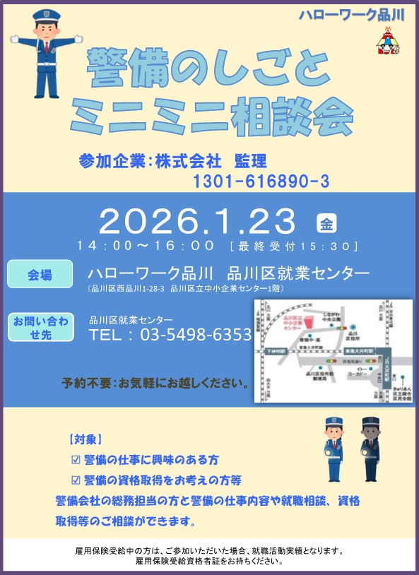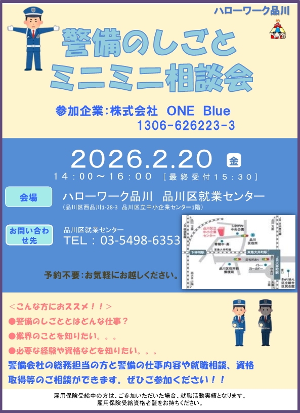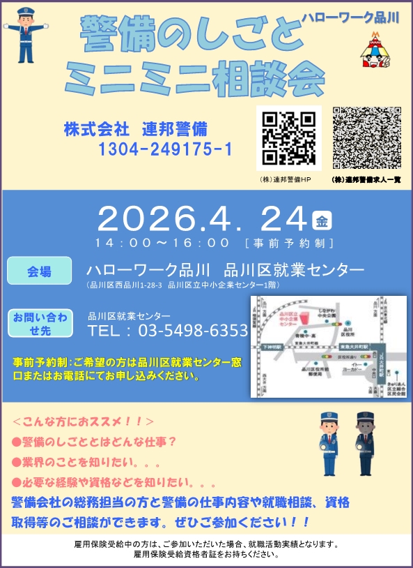 警備の仕事にご興味のある方、是非品川区就業センターへお越しください!!