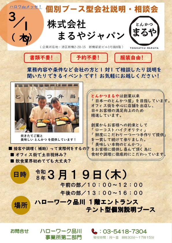 【令和8年3月19日(木)】ハロワdeメッセ(個別ブース型会社説明・相談会)のご案内~株式会社まるやジャパン~