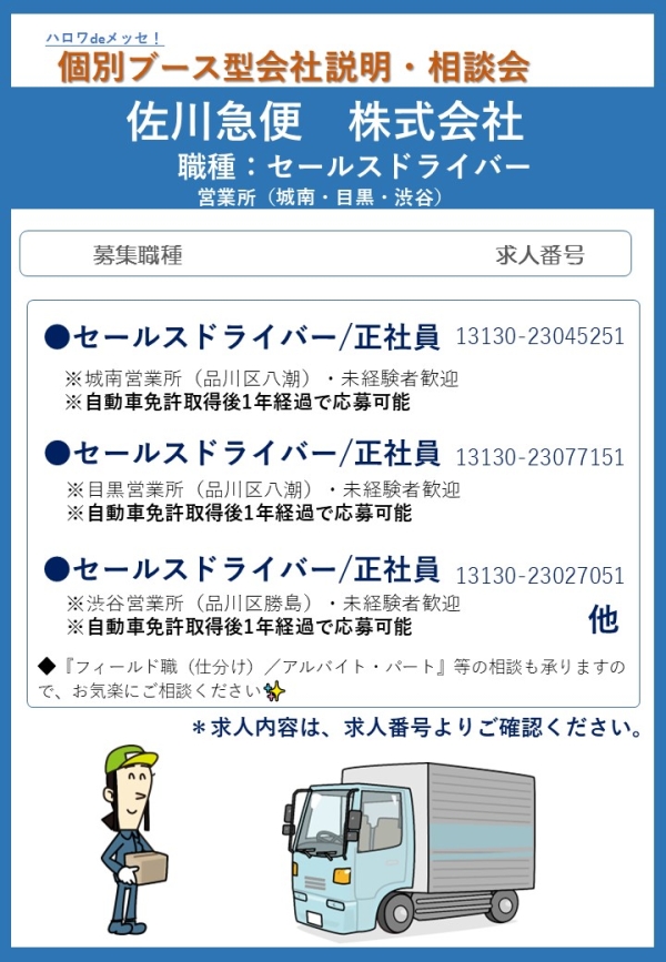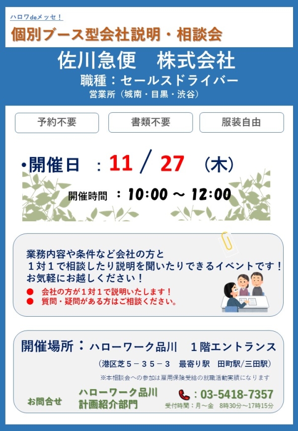【ハローワーク品川】11/27(木)ハロワdeメッセ(個別ブース型会社説明会・相談会)のご案内~佐川急便株式会社~