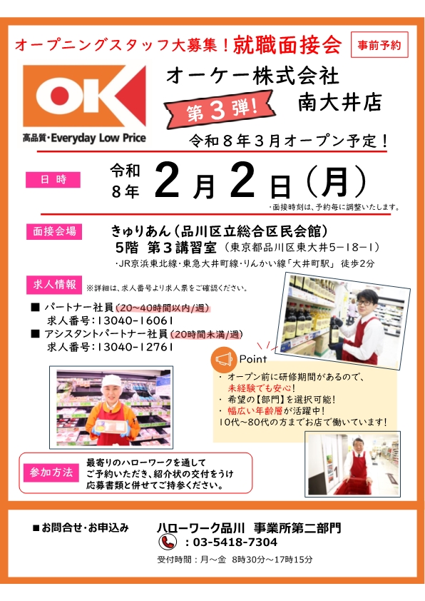 【令和8年2月2日(月)】オーケー株式会社 南大井店(仮称)ミニ就職面接会のお知らせ