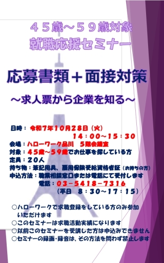 ☆参加ご希望の方は、ハローワーク品川 1階受付またはお電話にてお申し込みください。