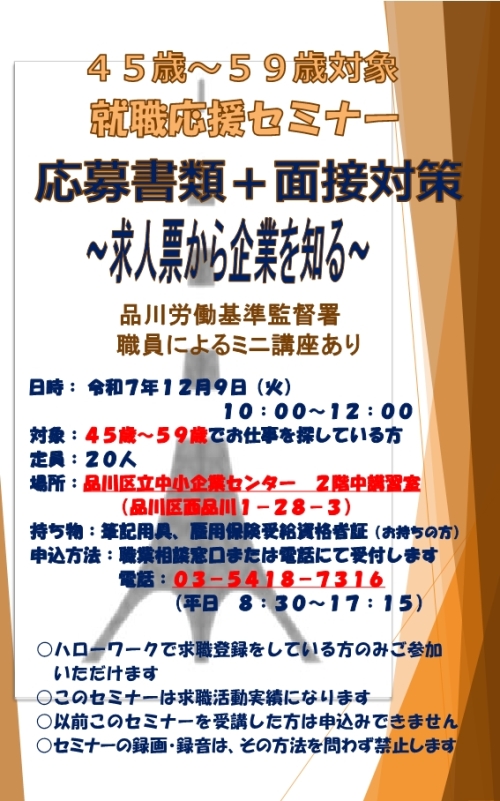 ☆参加ご希望の方は、ハローワーク品川 職業相談窓口またはお電話にてお申し込みください。
