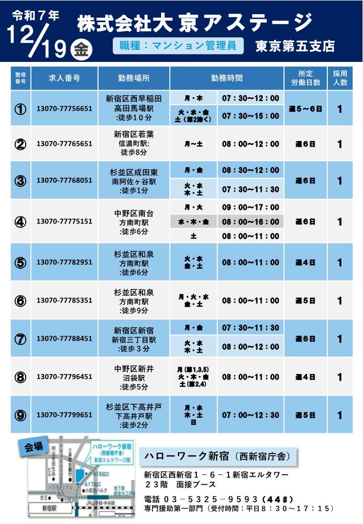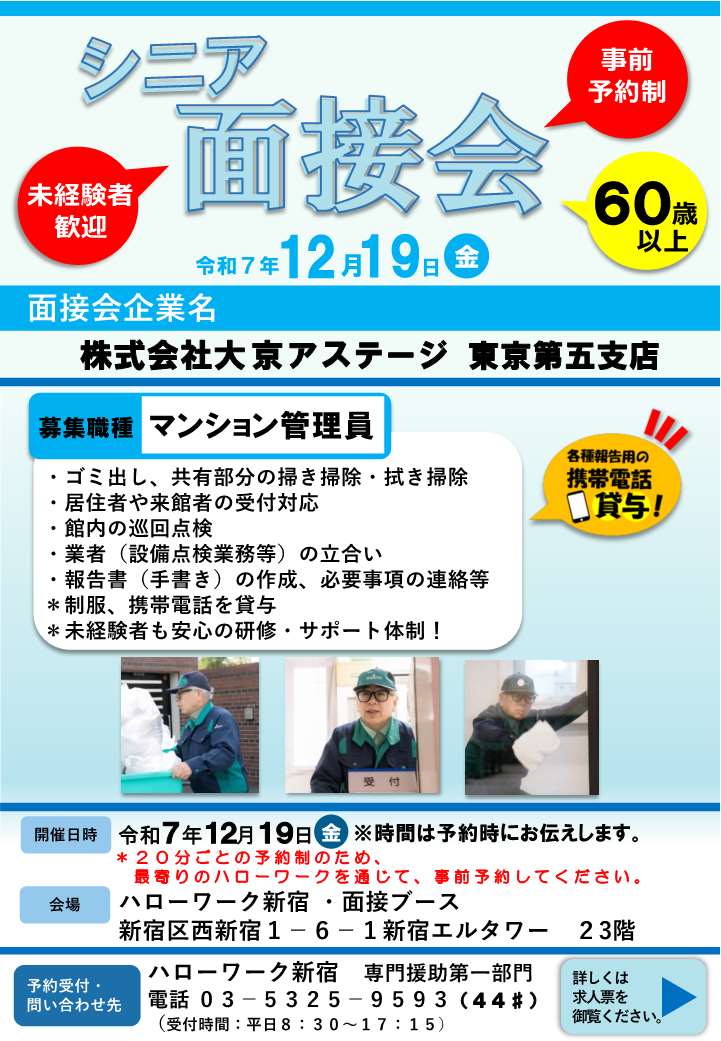 ハローワーク新宿23階面接ブースにて(新宿エルタワー23階:新宿区西新宿1-6-1)にて株式会社大京アステージ 東京第五支店のシニア面接会を開催します。