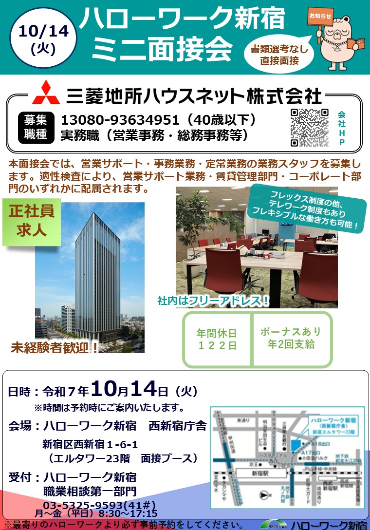 📢事前予約制になります。 参加予約はお近くのハローワーク職業相談窓口より 「ハローワーク新宿 職業相談第一部門」までご連絡ください。 ハローワーク新宿(西新宿庁舎)の新宿エルタワー23階 面接ブースを会場とした40歳以下の方向けにミニ面接会を開催します。 本面接会では、「実務業/営業事務・総務事務等」を募集します。 実務職は社内の営業サポート・事務業務・定常業務を担う職種です。適性検査を経て3部門いずれかの配属となります。