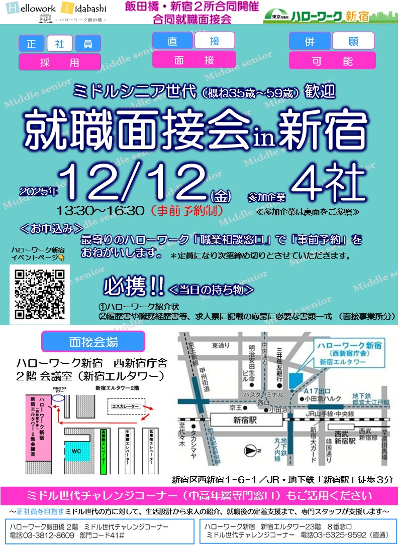 飯田橋・新宿2所合同開催 就職面接会開催のお知らせ【ミドルシニア世代歓迎就職面接会in新宿】