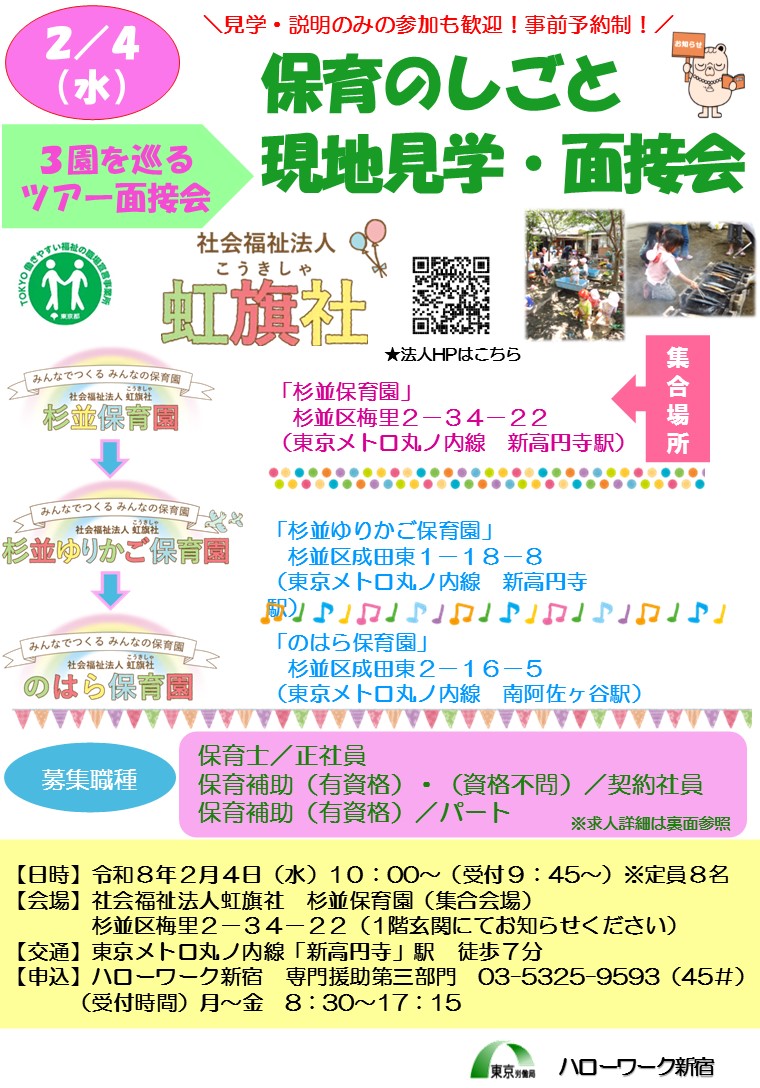 2/4(水) 保育のしごと 現地見学・面接会開催のお知らせ【社会福祉法人虹旗社】