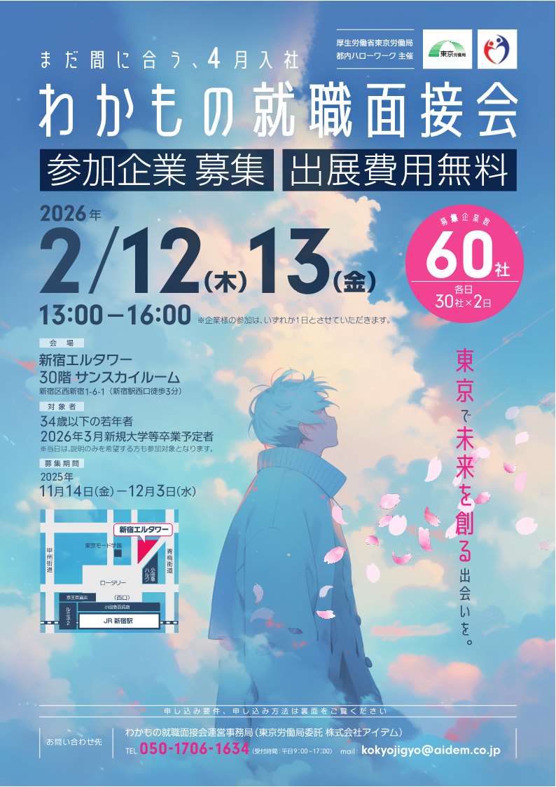 東京労働局(ハローワーク)では、株式会社アイデムに運営を委託し、まだ間に合う、4月入社!わかもの就職面接会を開催します。