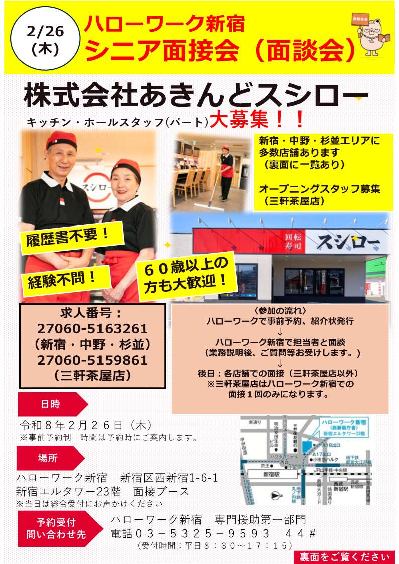 【新宿】【NEW】2/26(木) シニア面接会「株式会社あきんどスシロー」を開催します。