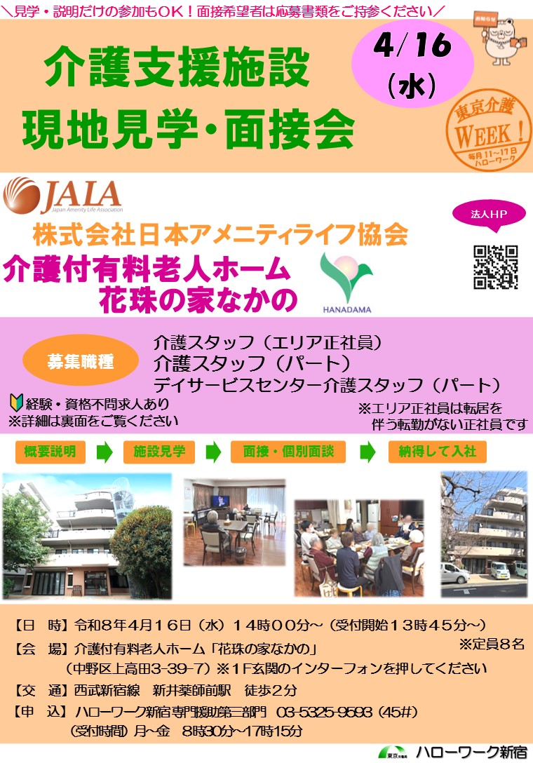 今回は「介護付有料老人ホーム 花珠の家なかの」と併設の「デイサービスセンター新井薬師前」についても見学できます。