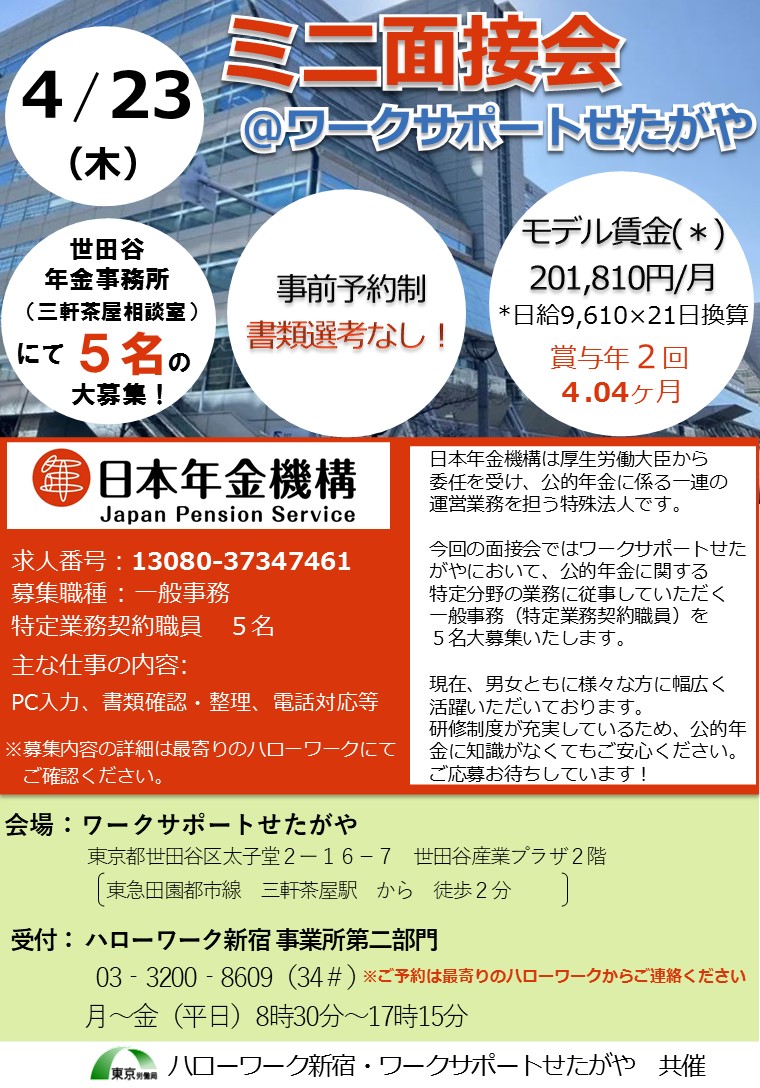 ★事前予約制になります。参加予約はお近くのハローワーク職業相談窓口より 「ハローワーク新宿 事業所第二部門」までご連絡ください。 ワークサポートせたがやを会場とした面接会を開催します。 現在、男女ともに様々な方が幅広く活躍中です。 この機会に是非ご応募ください! リーフレット、求人票はこちらをご覧ください。 ◇リーフレット ◇求人票