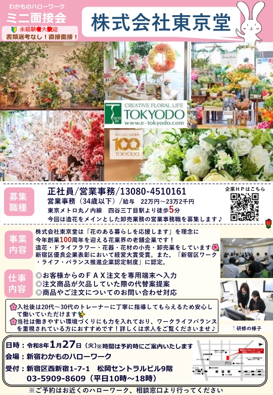 新宿わかものハローワーク(松岡セントラル9階)セミナールームを会場としたミニ面接会を開催します。
