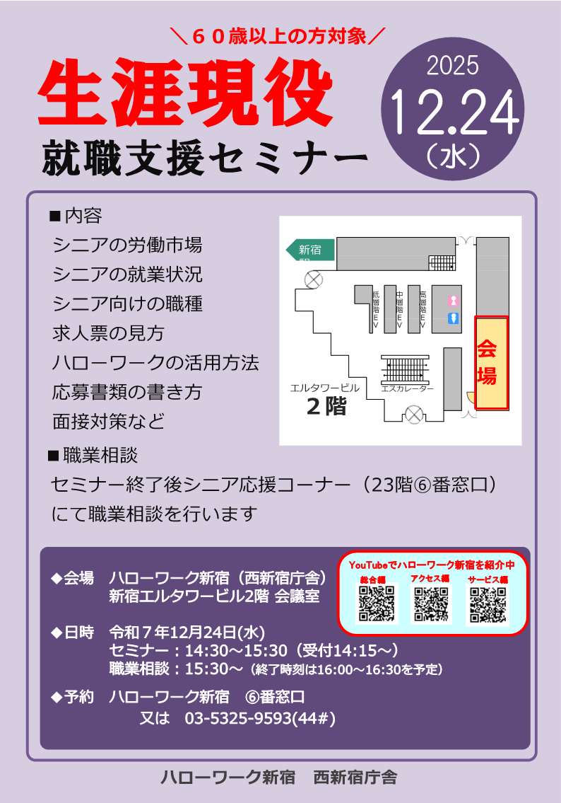 ハローワーク新宿西新宿庁舎にてシニア世代の方を対象とした就職支援セミナーを開催します。