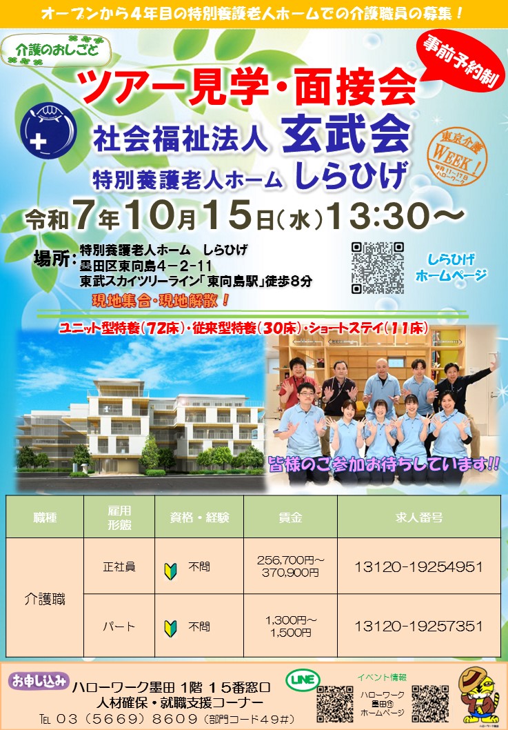 10月15日 特別養護老人ホームしらひげ(社会福祉法人玄武会) ツアー見学・面接会(ハローワーク墨田)
