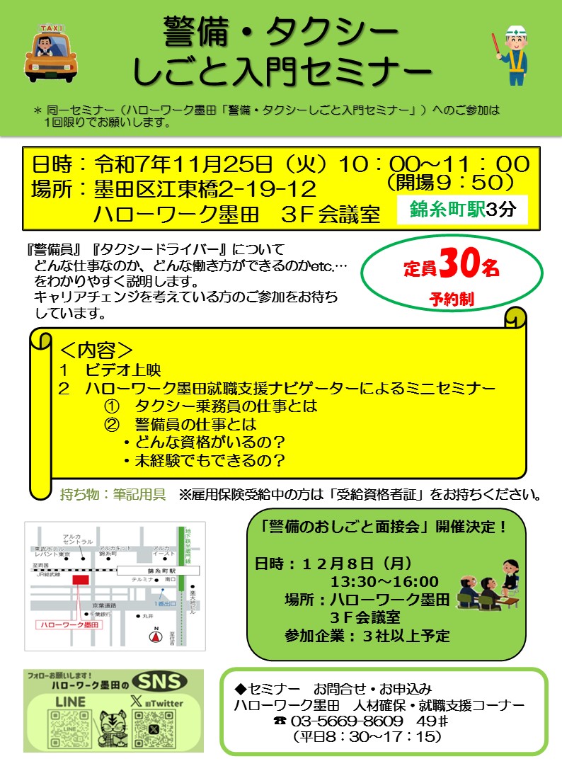 ハローワーク墨田にて、警備員・タクシードライバーについての入門セミナーを行います。