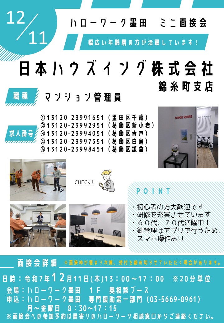 【12月11日】日本ハウズイング株式会社錦糸町支店 ミニ面接会