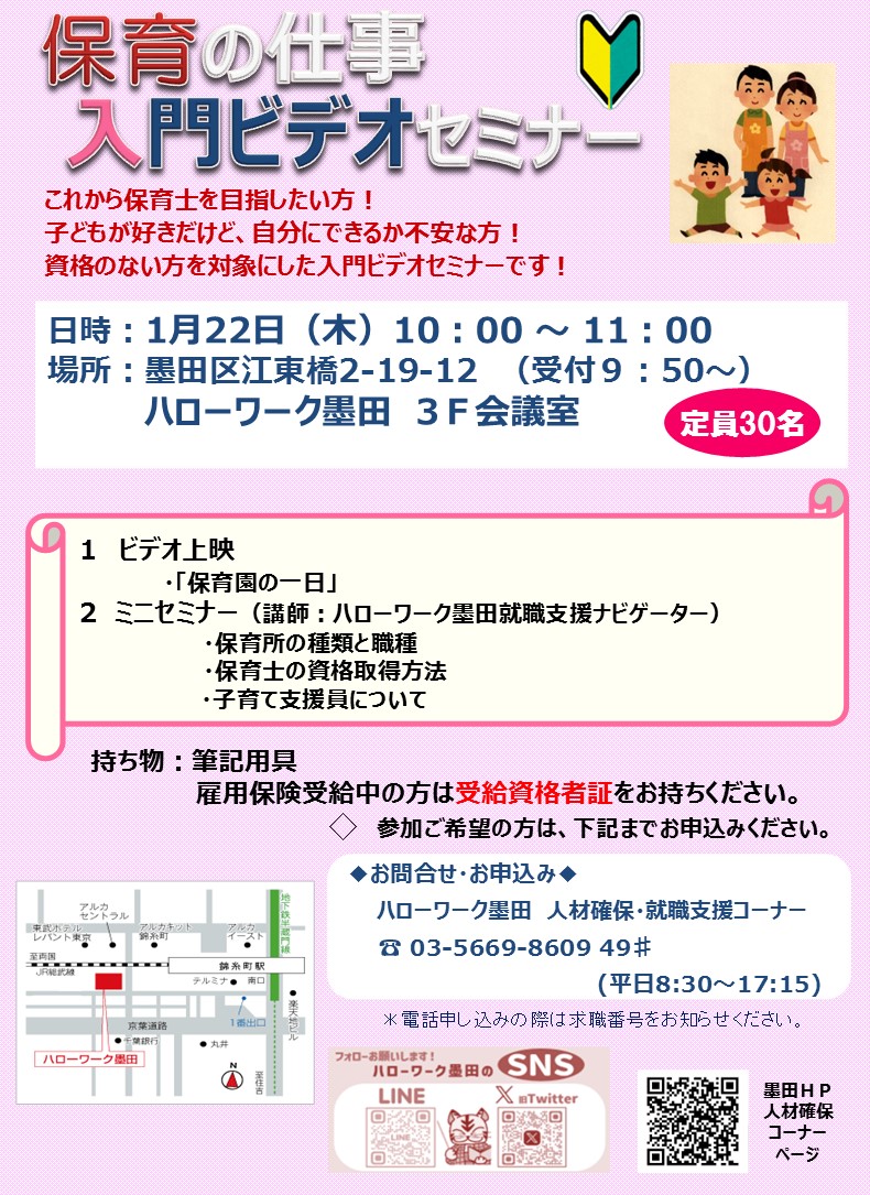 ハローワーク墨田で、保育の仕事入門ビデオセミナーを開催します。