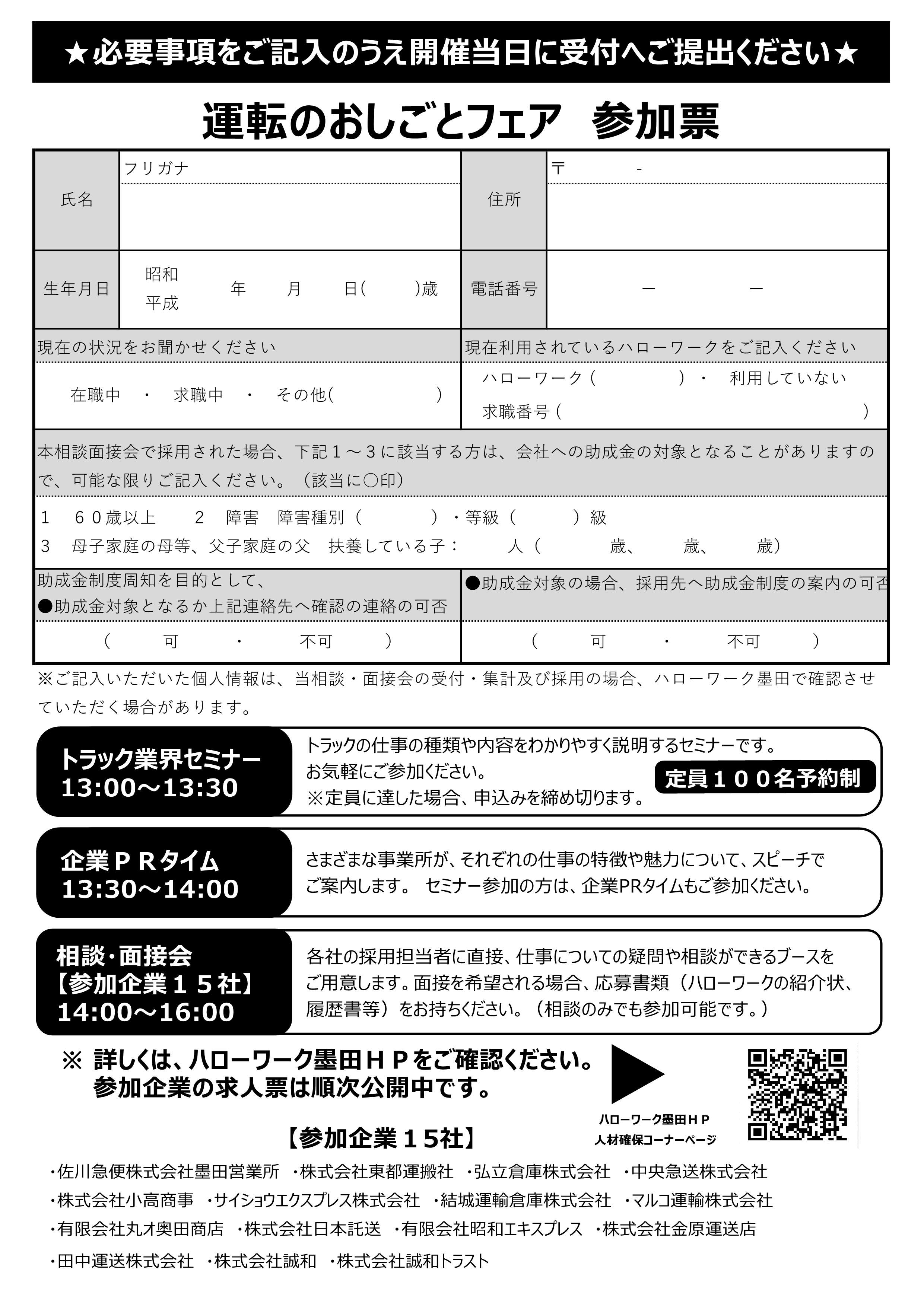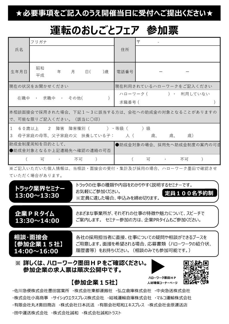 ○ ご参加希望の方は、リーフレット裏面にある「参加票」をご記入の上、入場時にご提出ください。お持ちでない場合は当日その場でご記入いただきます(セミナー・PRタイム・相談面接会、全ての入場者対象)。