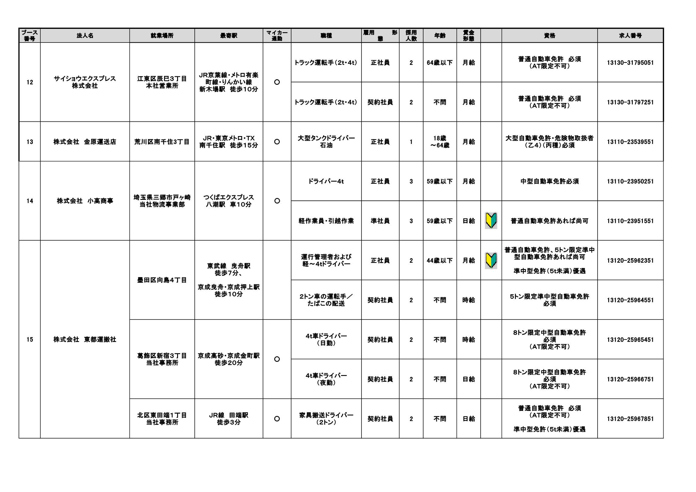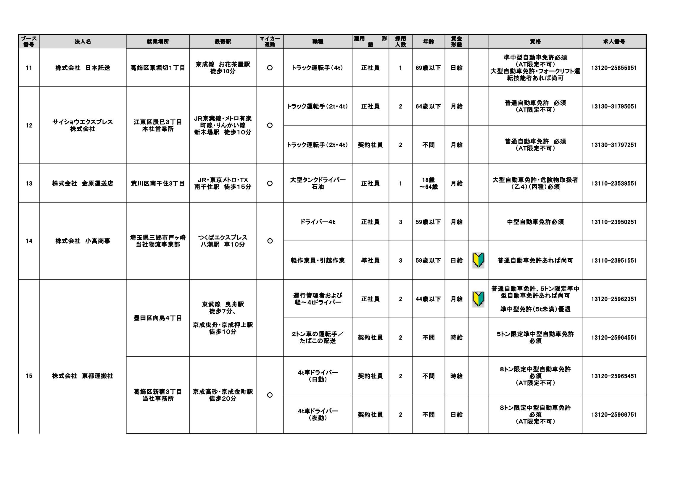 東京都トラック協会に所属している15社が集結。運転の仕事の他、運転免許不要の求人も複数あります。運転の仕事も、普通車からタンクローリーまでさまざまな運転の求人があります。