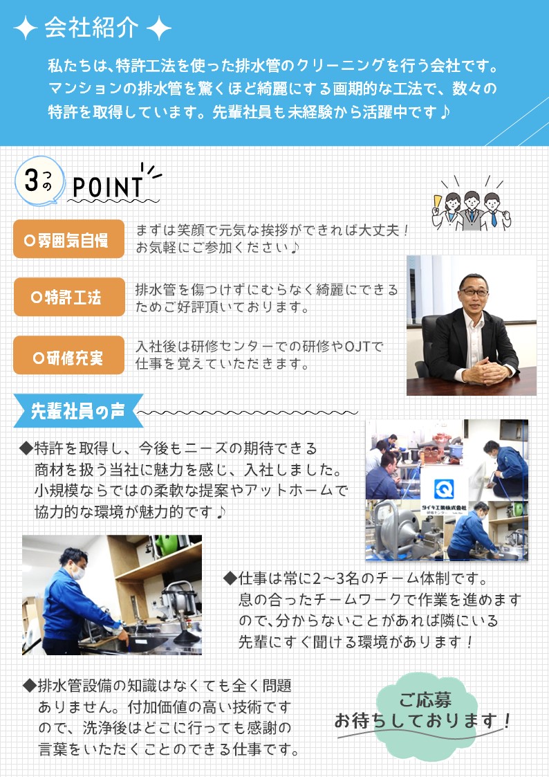 | 排水管メンテナンス | 正社員 | 2 | 13120-1472561 |