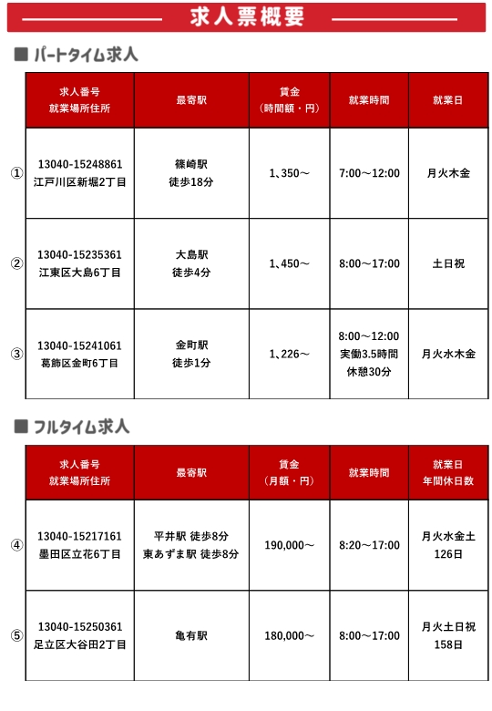 | 勤務形態 | 就業場所住所 | 最寄駅 | 賃金 | 就業時間 | 就業日 年間休日数(フルタイム) |