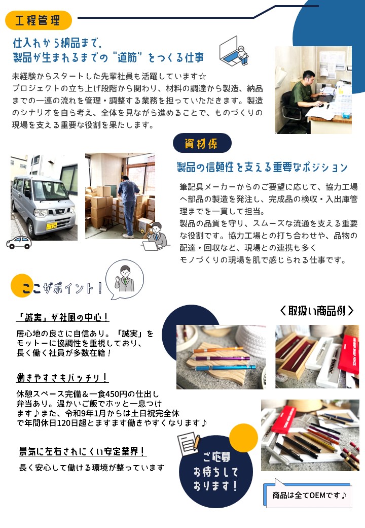- 筆記具製造の工程管理(正社員・44歳以下対象)、筆記具製造の資材係(正社員・44歳以下対象)