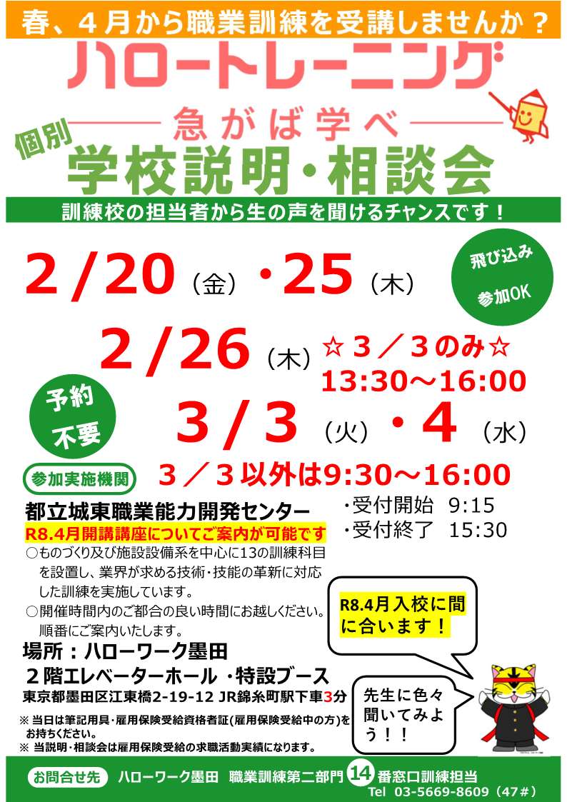 【2/20、25、26、3/3、4開催】ハロートレーニング 個別学校説明・相談会(都立城東職業能力開発センター)