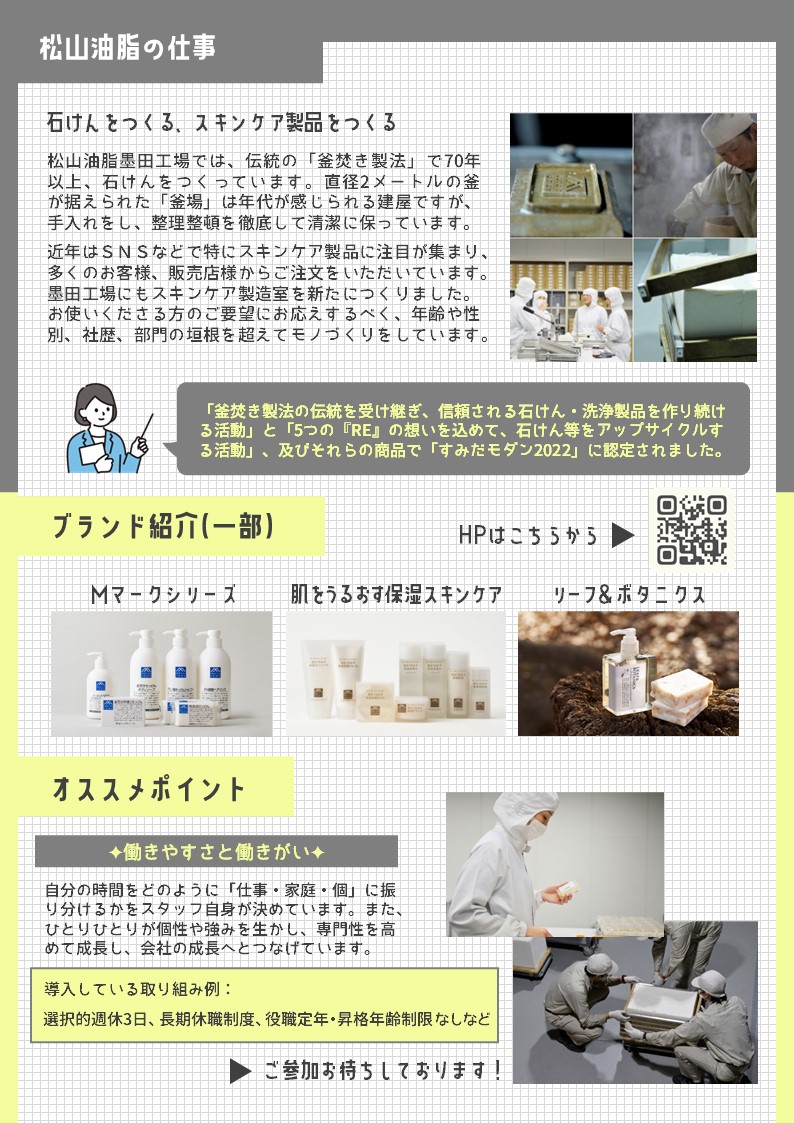 今回の見学会を通して松山油脂がどんな会社かを知り、仕事に共感し、「モノづくりがしたい」「モノづくりにかかわる仕事がしたい」と思っていただけることを願っています。