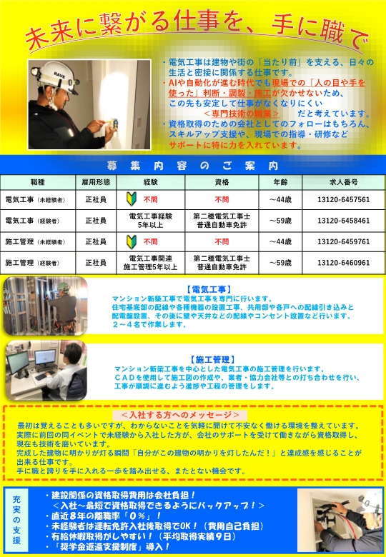 - 電気工事士(未経験者~44歳/経験者~59歳)、施工管理(電気)(未経験者~44歳/経験者~59歳)